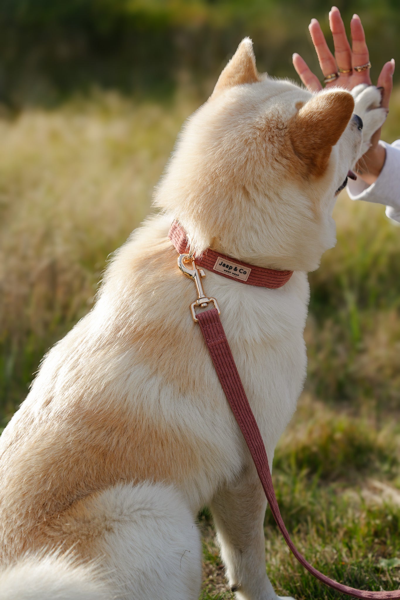 Gemaakt van stevig maar comfortabel koraalkleurig corduroy, zit de halsband prettig en zacht voor je hond. De goudkleurige metalen details voegen een luxueuze, elegante touch toe, waardoor jullie samen stralen tijdens elke wandeling.