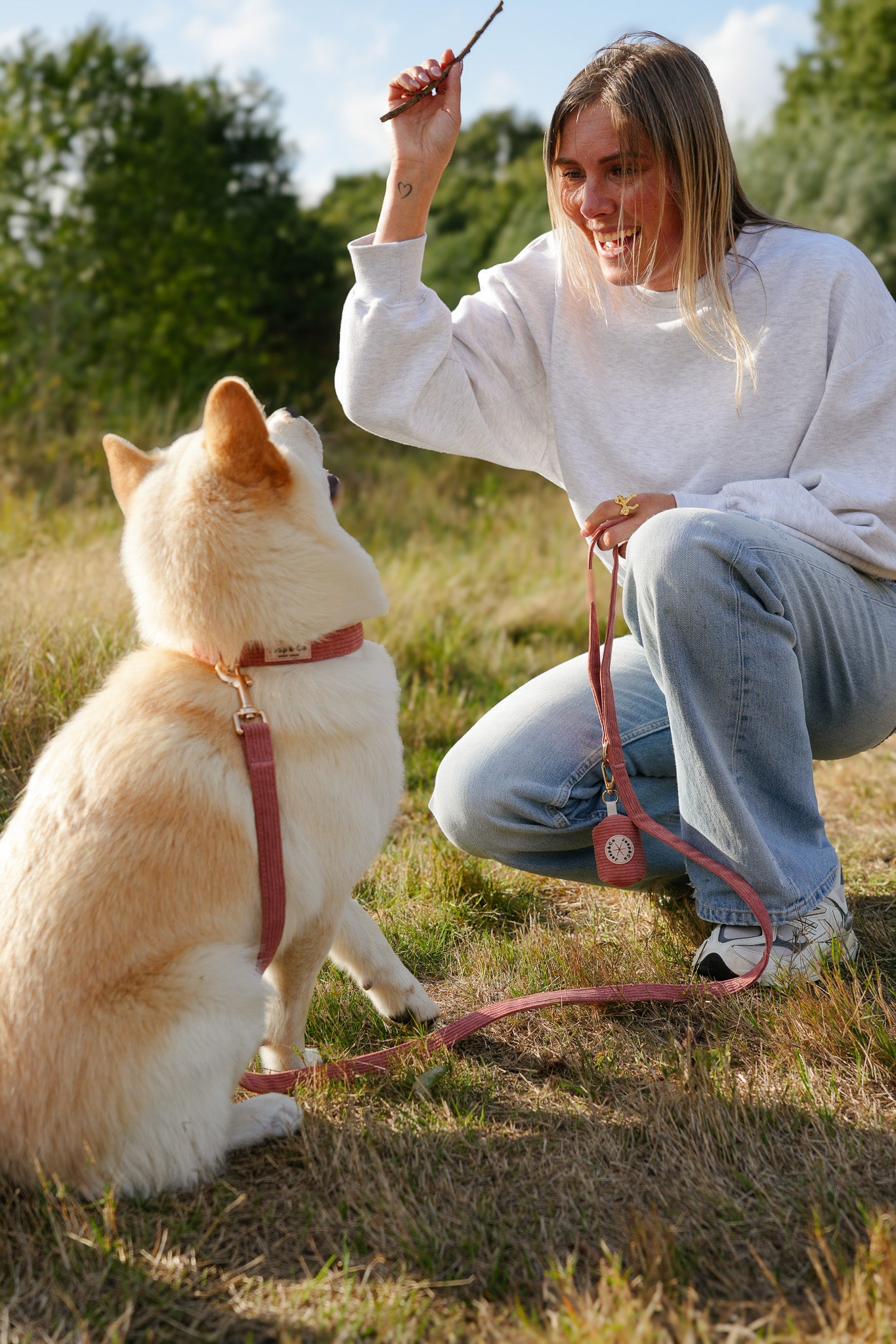 De comfortabele halsband, stevige riem (152 cm) en handige poepzakjeshouder zijn allemaal gemaakt van slijtvast, zacht aanvoelend corduroy en afgewerkt met goudkleurige metalen details. Zo straal je tijdens elke wandeling pure golden-hour vibes uit.